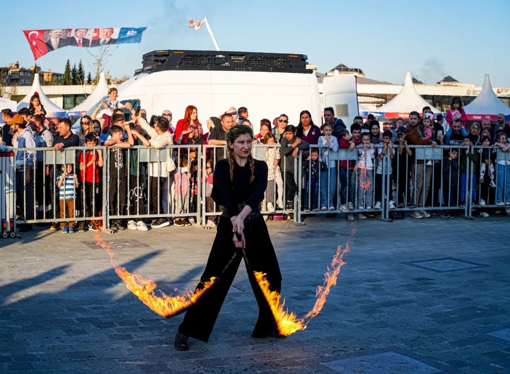 Gösteri, dansçıların iplerin ucuna asılı ateş toplarını ustalıkla çevirmesiyle başladı. Ateş toplarını havada adeta uçuran dansçılar, sergiledikleri performansla seyircilerden büyük alkış topladı. Ardından sahneye çıkan ateşbazlar, ağızlarından püskürttükleri alevlerle heyecanı doruk noktasına taşıdı. Minik izleyiciler, bu büyüleyici anları nefeslerini tutarak takip etti.